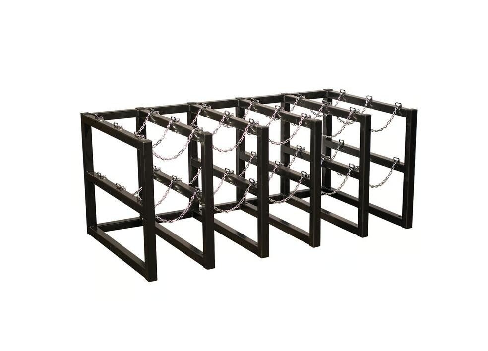 Gaz tüpü rafları, depolama sırasında gaz tüplerini dik ve güvenli tutar.Silindirleri destekleyen ve onları sıralar halinde tutan dikey dikmelere sahiptirler.Ayrıca silindirleri rafların içinde sabit tutan zincirleri vardır.Raflar bir zemin üzerinde duruyor..
